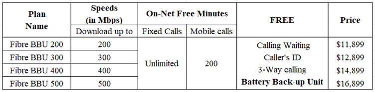 Fibre with Battery back-up unit (BBU) is a total home solution for broadband users. Fibre with BBU offers Internet + Telephone + Back-up power supply as a single solution. This package keeps your home internet and telephone services connected in the event of planned or unplanned power outages.