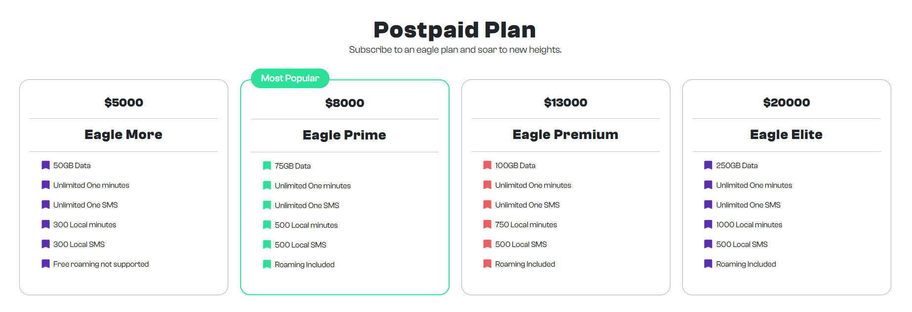 Four Eagle plans are offered for this promotion. The price and number of allocations for each plan vary as shown below. Each is suited for different customers based on the monthly mobile usage.